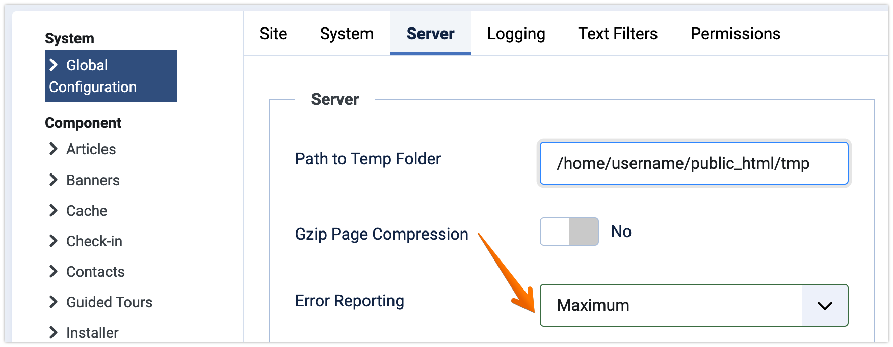 After that, go to the Server tab and set the Error Reporting field to Maximum. Click Save to save the changes.